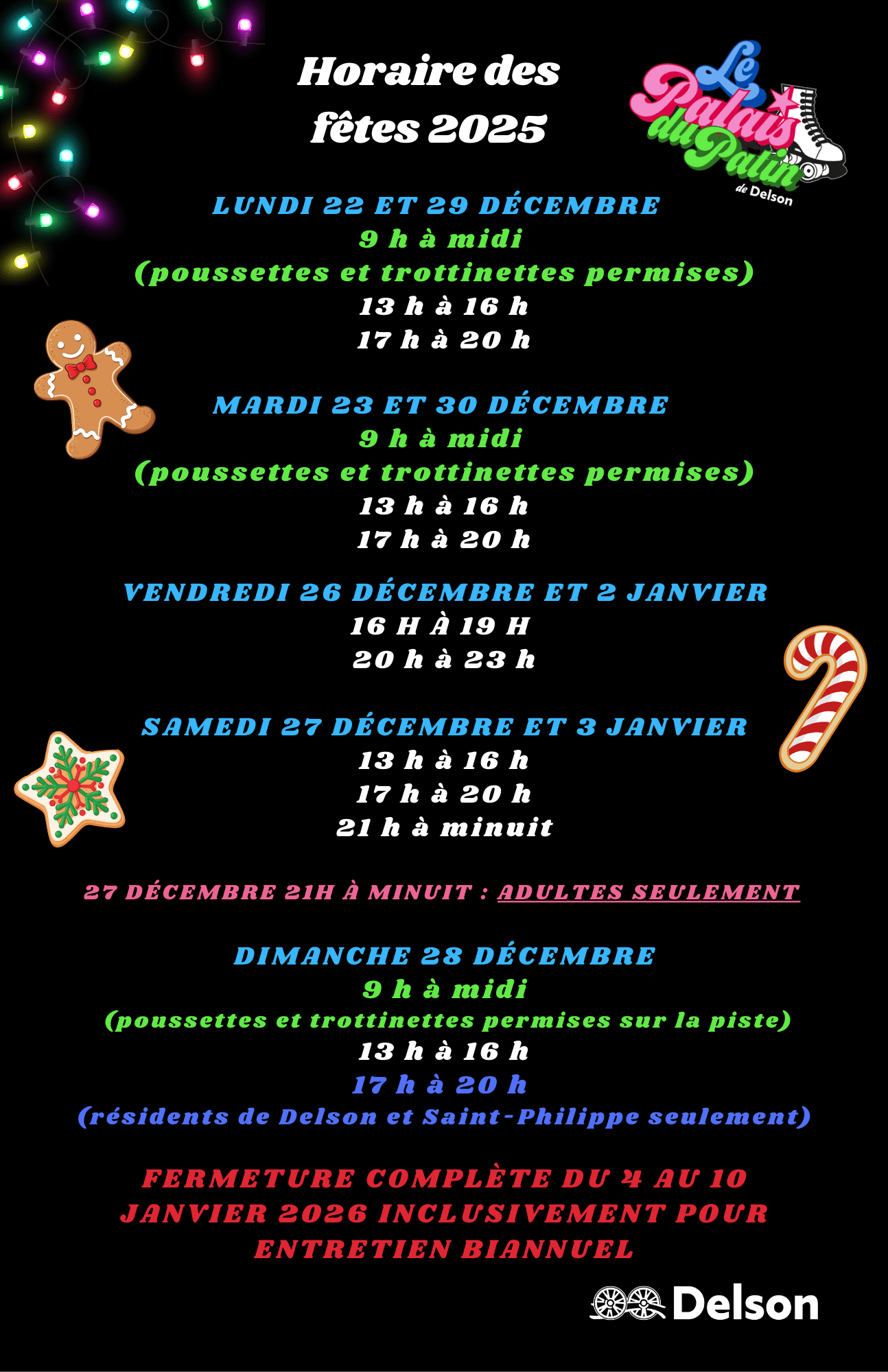La demande pour des heures d’ouverture au grand public a commencé à se faire sentir à nouveau, en plus des demandes de location pour des fêtes d’enfants, des soirées pour les associations sportives ou pour des sorties scolaires. La Ville de Delson a fait une rénovation complète du Palais du patin en 2021. Tout a été pensé pour retrouver les couleurs de l’époque disco, en y ajoutant les meilleures technologies sonores et visuelles de notre époque. Le résultat est à couper le souffle!
